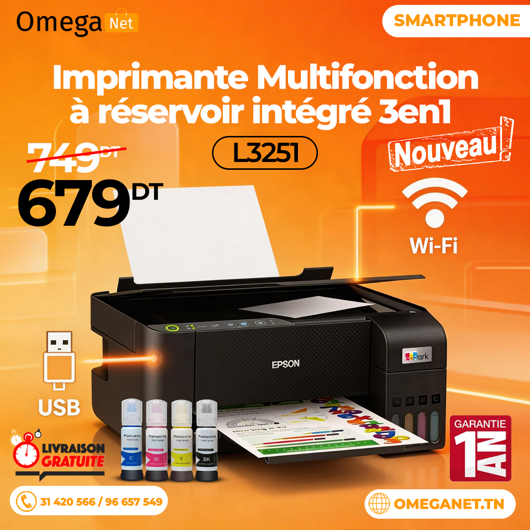 Imprimante Multifonction à réservoir intégré 3en1 couleur Epson ECOTANK L3251 / WiFi + 5 Bouteilles d’encre Epson Incluses